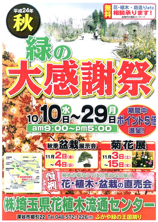 秋 緑の大感謝祭! 2012年10月10日(水)〜29日(月)の期間、埼玉県花植木流通センターでは『秋 緑の大感謝祭』を開催いたします。 植木市場ならではの豊富な品揃え!花・植木・盆栽の直売会を実施。 11月2日(金)〜11月4日(日)には、秋季盆栽展示会を開催。 また、続けて11月3日からは、菊花展も行われますので、この機会に、ぜひ埼玉県花植木流通センターまでお越し下さい。 花・植木・庭造りなど無料相談も承ります。 詳しくはお問い合せ下さい。 埼玉県花植木流通センター TEL:048-572-1226(代表) |